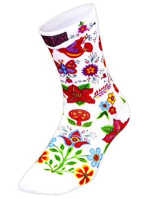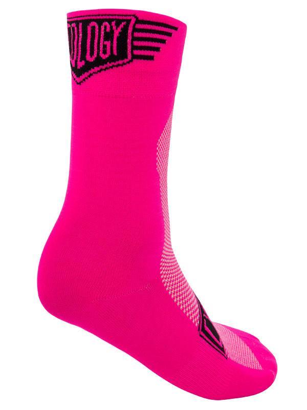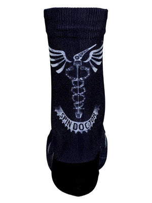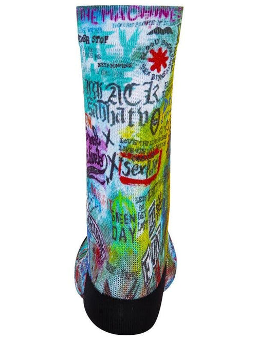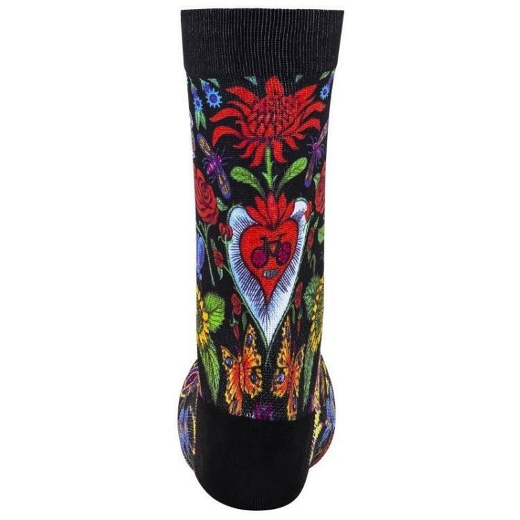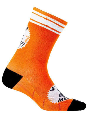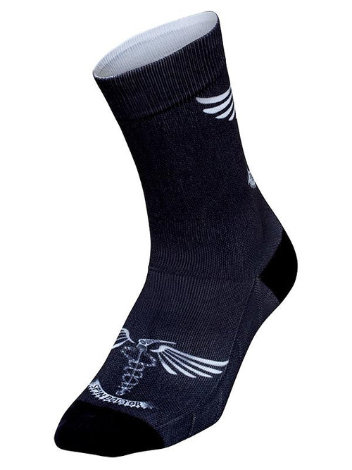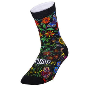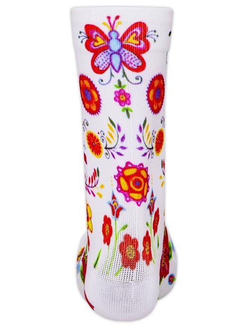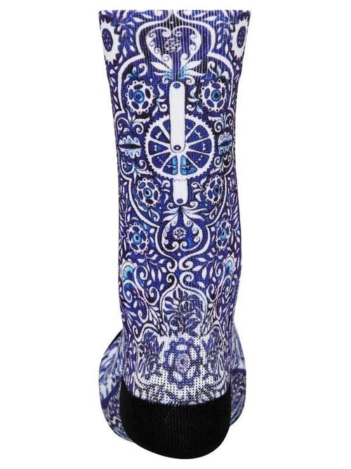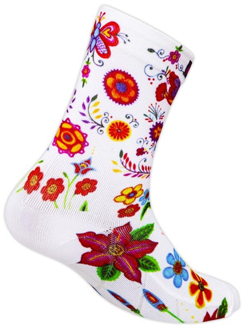 The printed compression cycling socks are made from a fabric that provides excellent moisture-wicking for comfort & durability. Flat toe seam construction provides superior foot comfort. A more elastic knit keeps a snugger fit around the arch for good support and a ribbed knit cuff at the top of the 7”(18cm) leg length from ankle, keeps them firm but comfy.