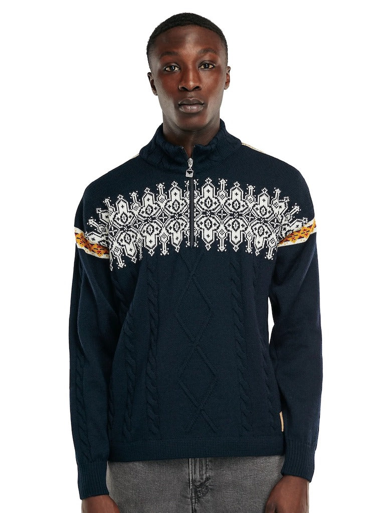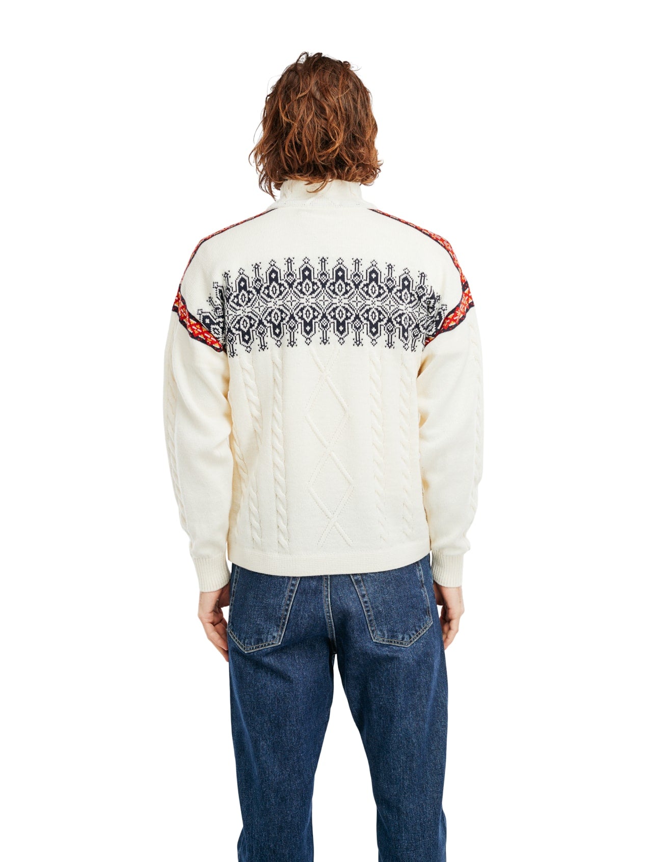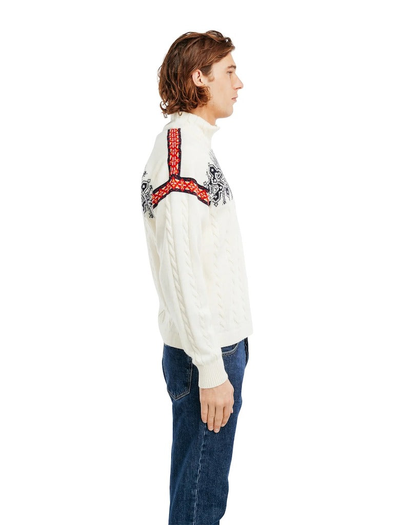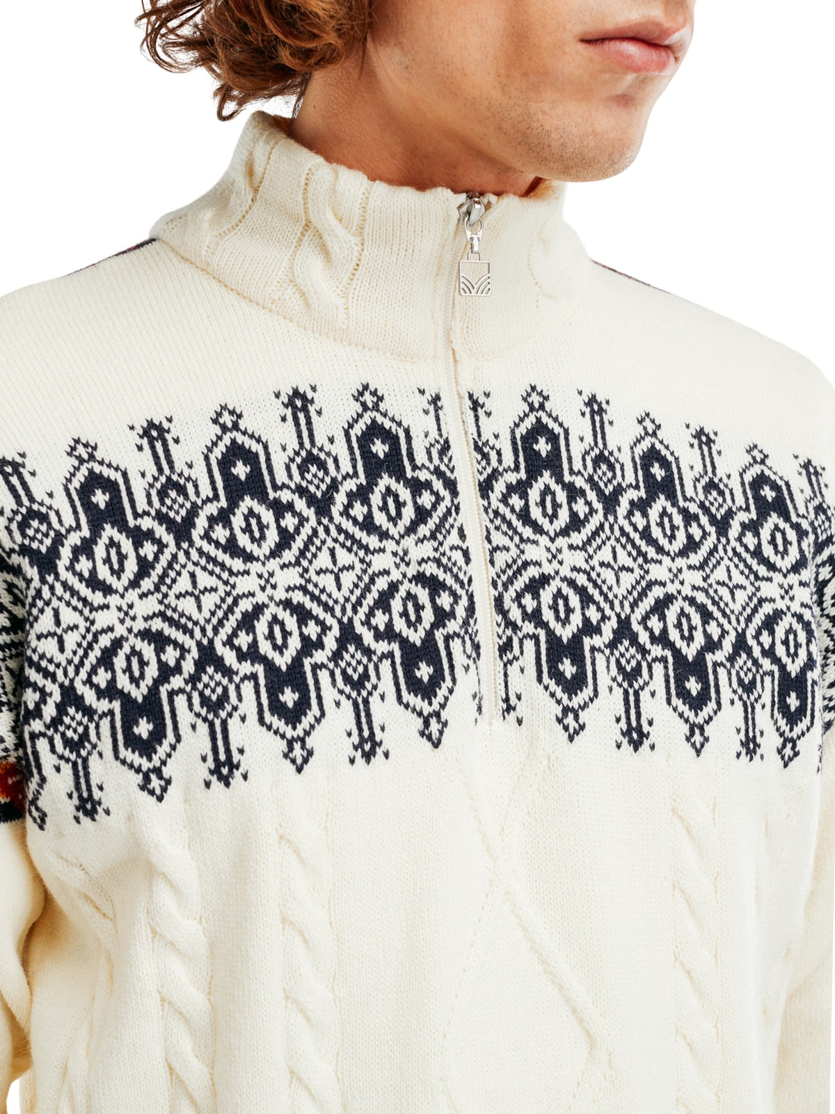 The Dale of Norway mens Aspoy sweater is s loose fit, retro looking sweater inspired by 1992 Albertville Olympic sweater. This comfortable wool sweater features a combination of cable knit and knitted patterns. The cable knit medium high neck is lined with skin soft merino wool for extra comfort. Drop shoulders and rib knit cuffs tops off this sweater made with 100% lightweight wool.