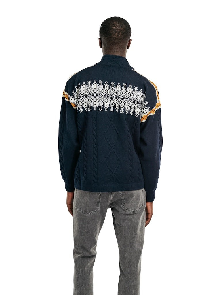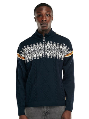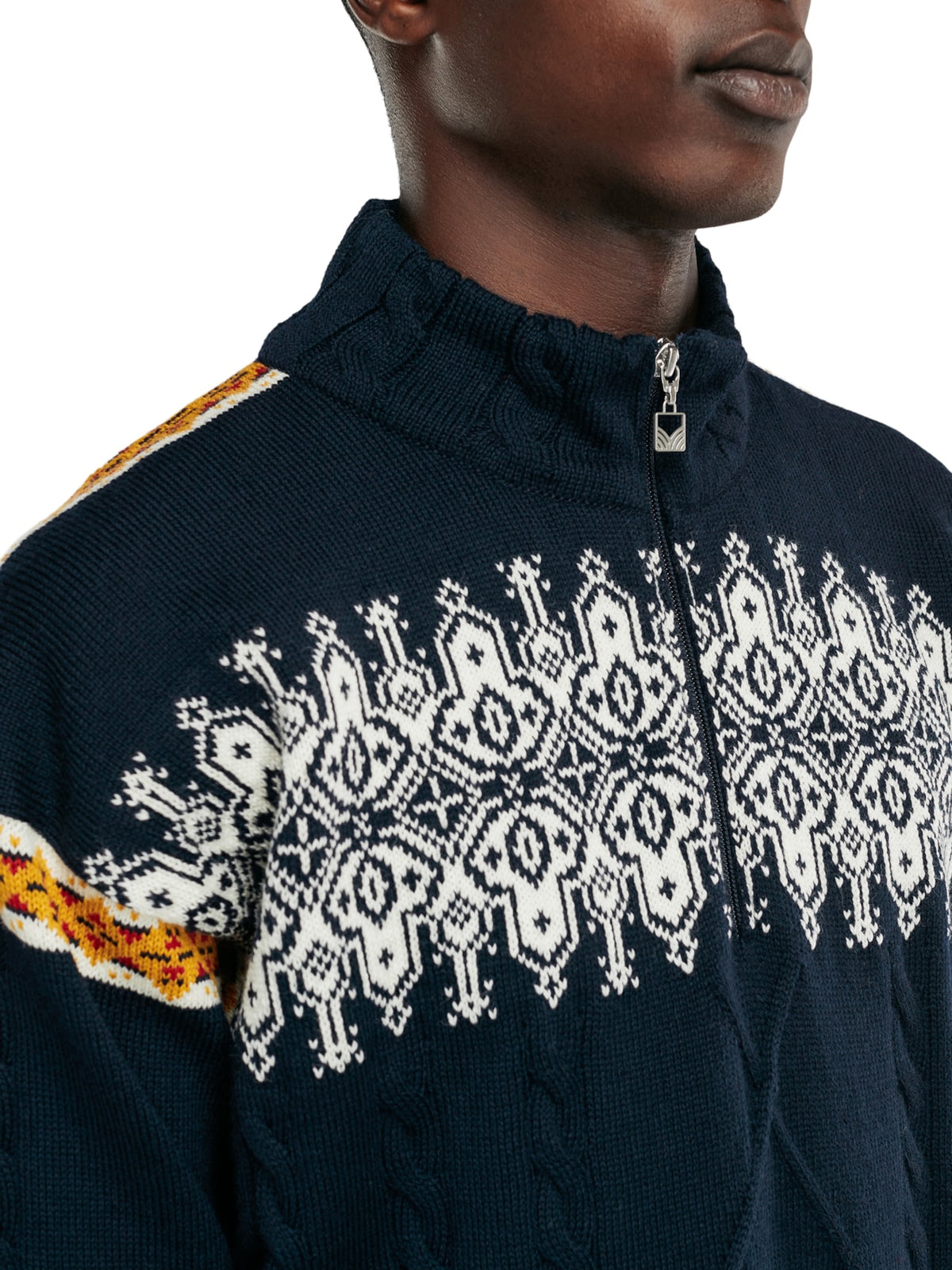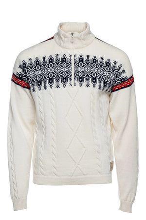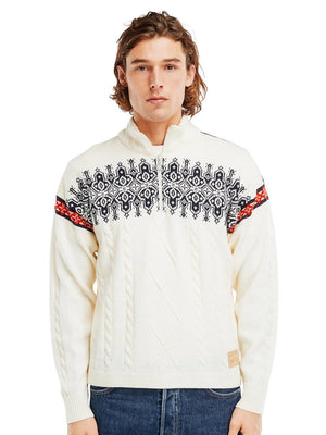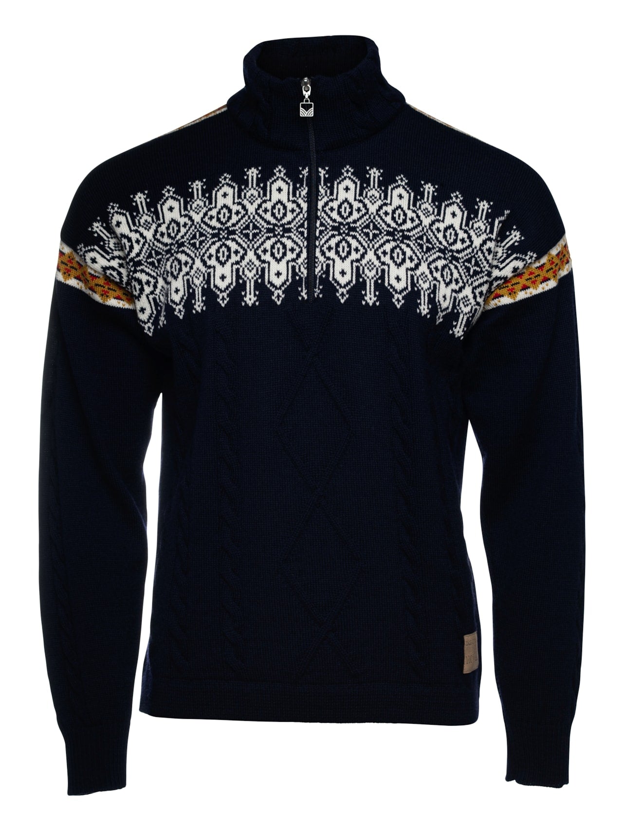 The Dale of Norway mens Aspoy sweater is s loose fit, retro looking sweater inspired by 1992 Albertville Olympic sweater. This comfortable wool sweater features a combination of cable knit and knitted patterns. The cable knit medium high neck is lined with skin soft merino wool for extra comfort. Drop shoulders and rib knit cuffs tops off this sweater made with 100% lightweight wool.