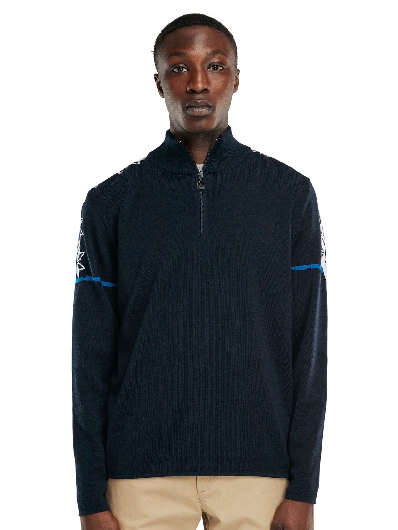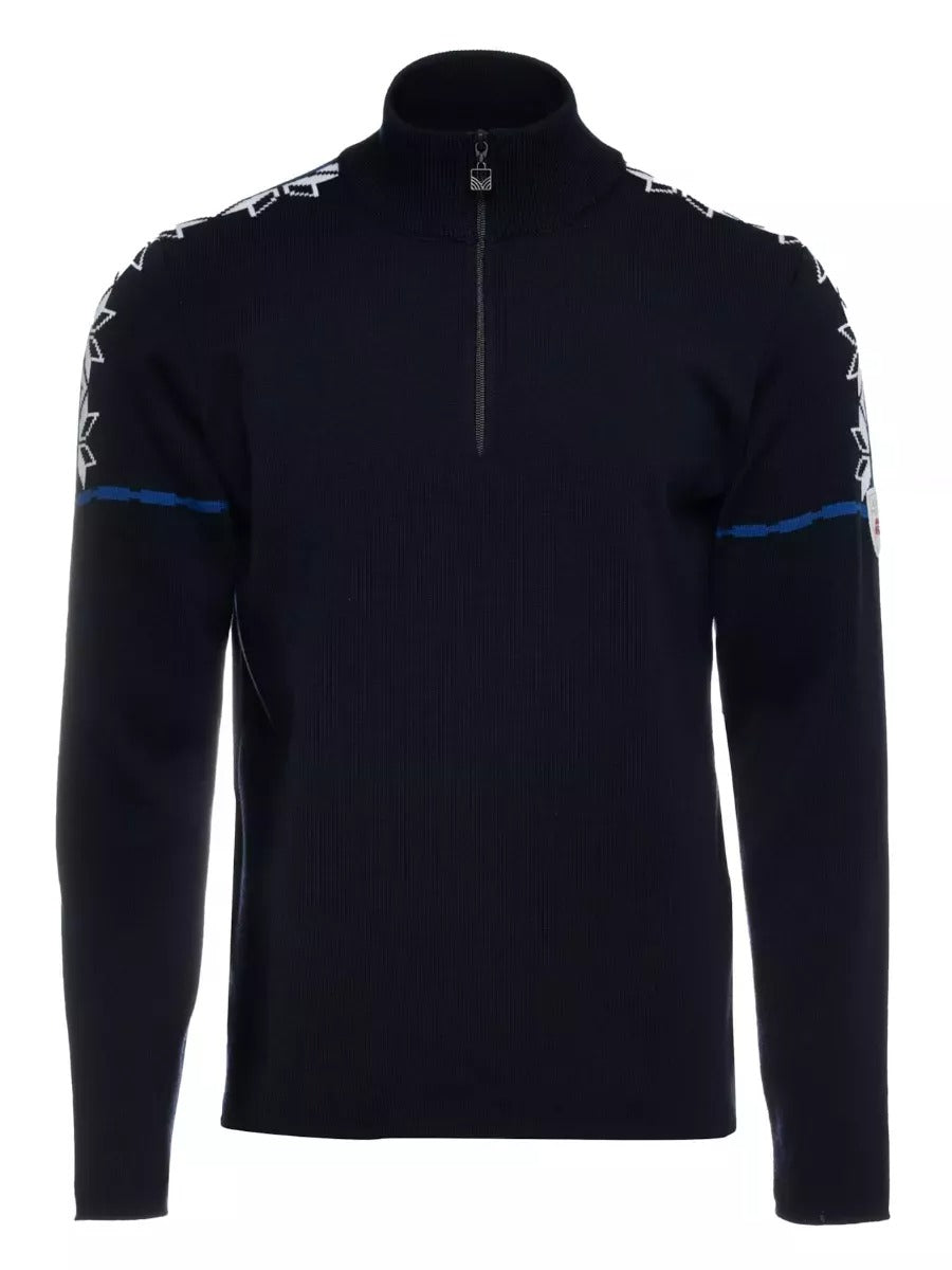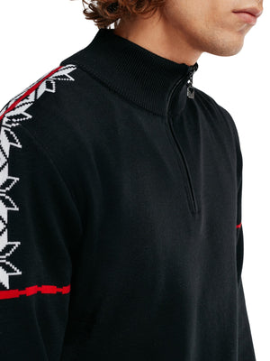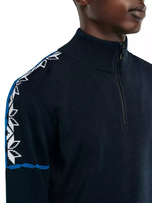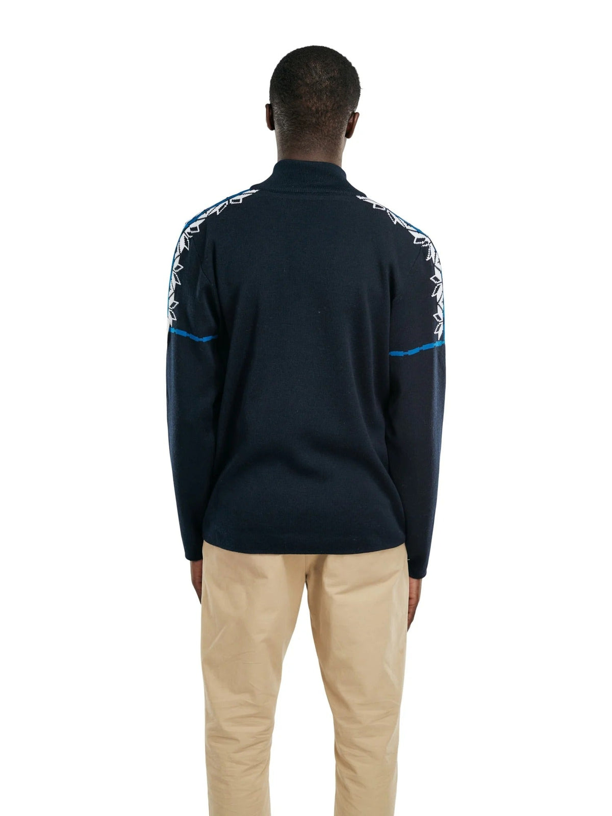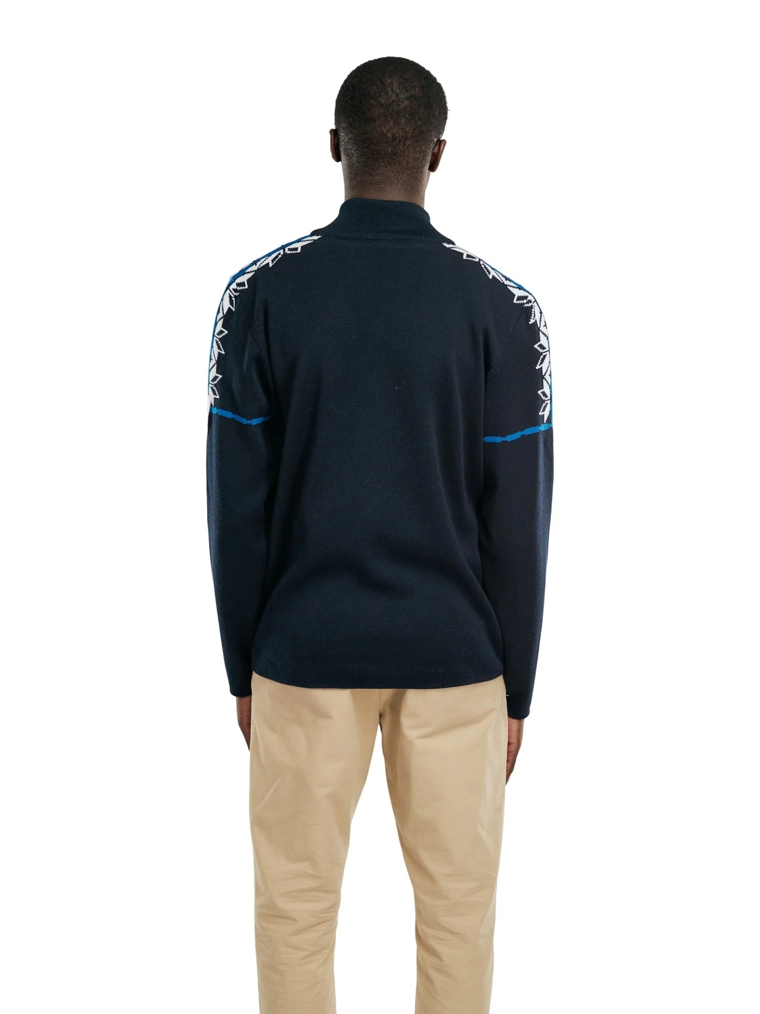 The Mount Blåtind is a sporty sweater made of 100% soft extra-fine merino wool. The merino wool sweater features a comfortable high neck with a quarter zip. A refined version of the classic Norwegian eight-petal rose adorns the shoulders and brings hints of snow crystals and winter stars to the design.
