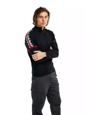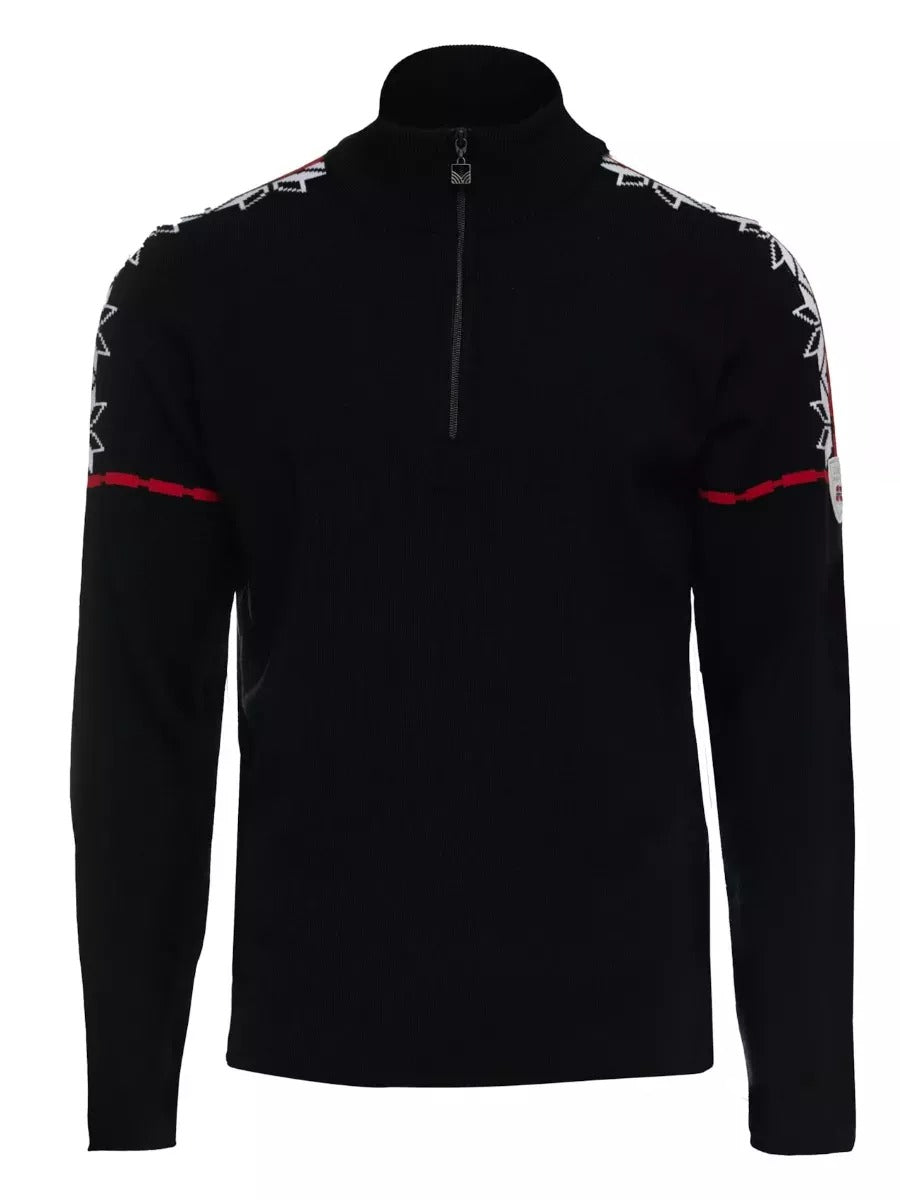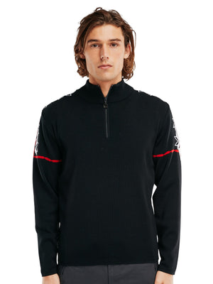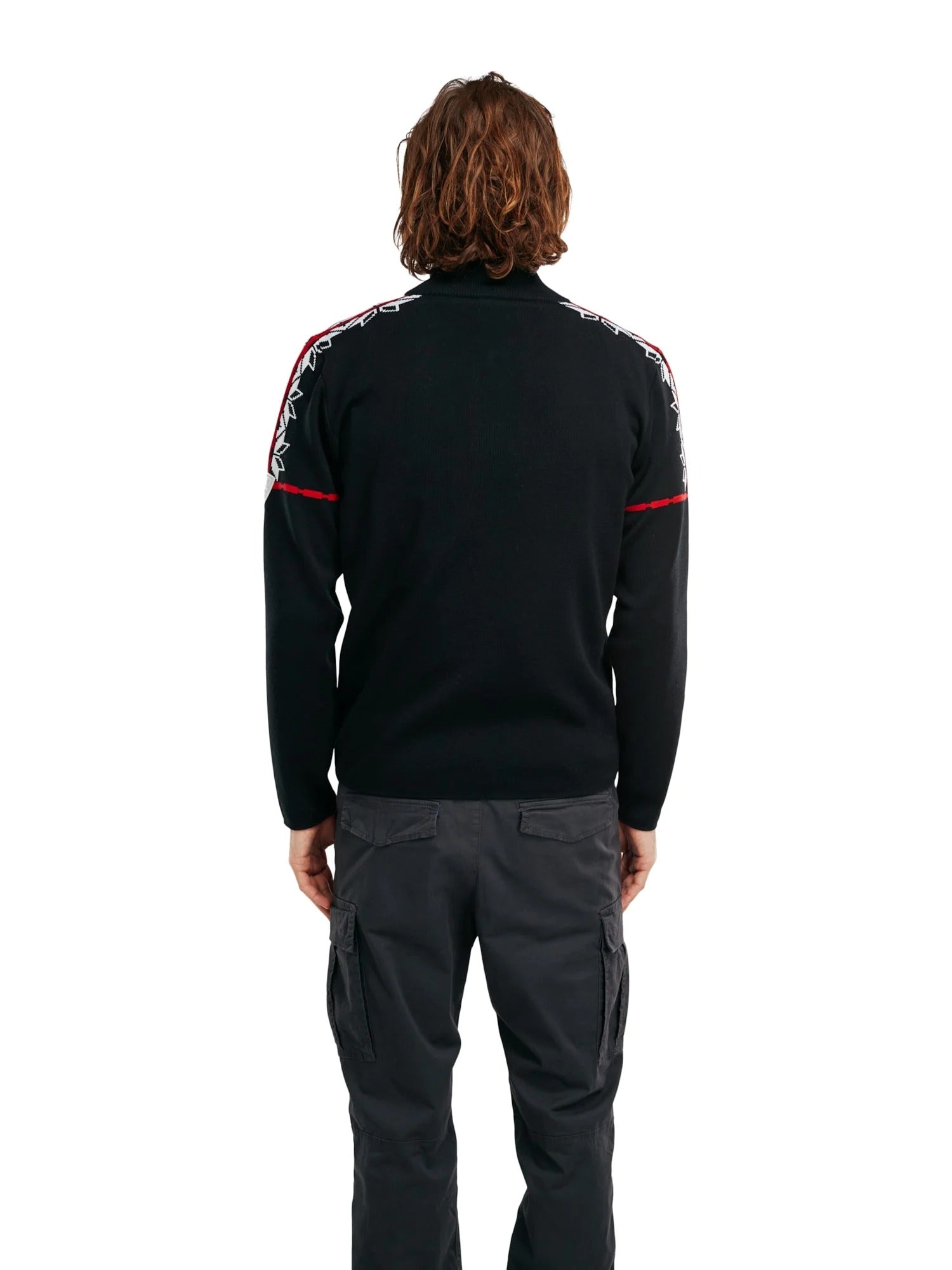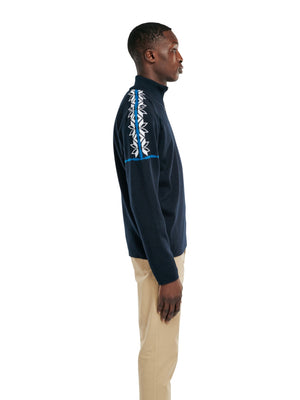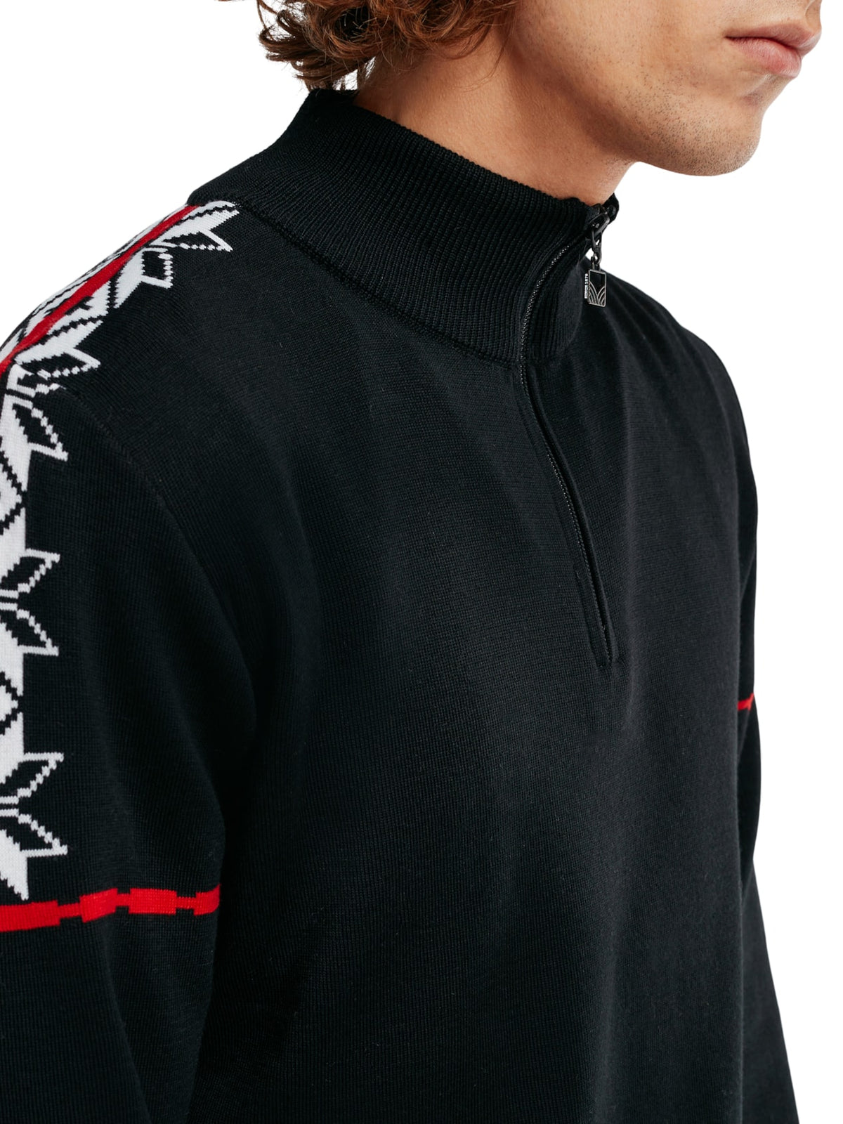 The Mount Blåtind is a sporty sweater made of 100% soft extra-fine merino wool. The merino wool sweater features a comfortable high neck with a quarter zip. A refined version of the classic Norwegian eight-petal rose adorns the shoulders and brings hints of snow crystals and winter stars to the design.