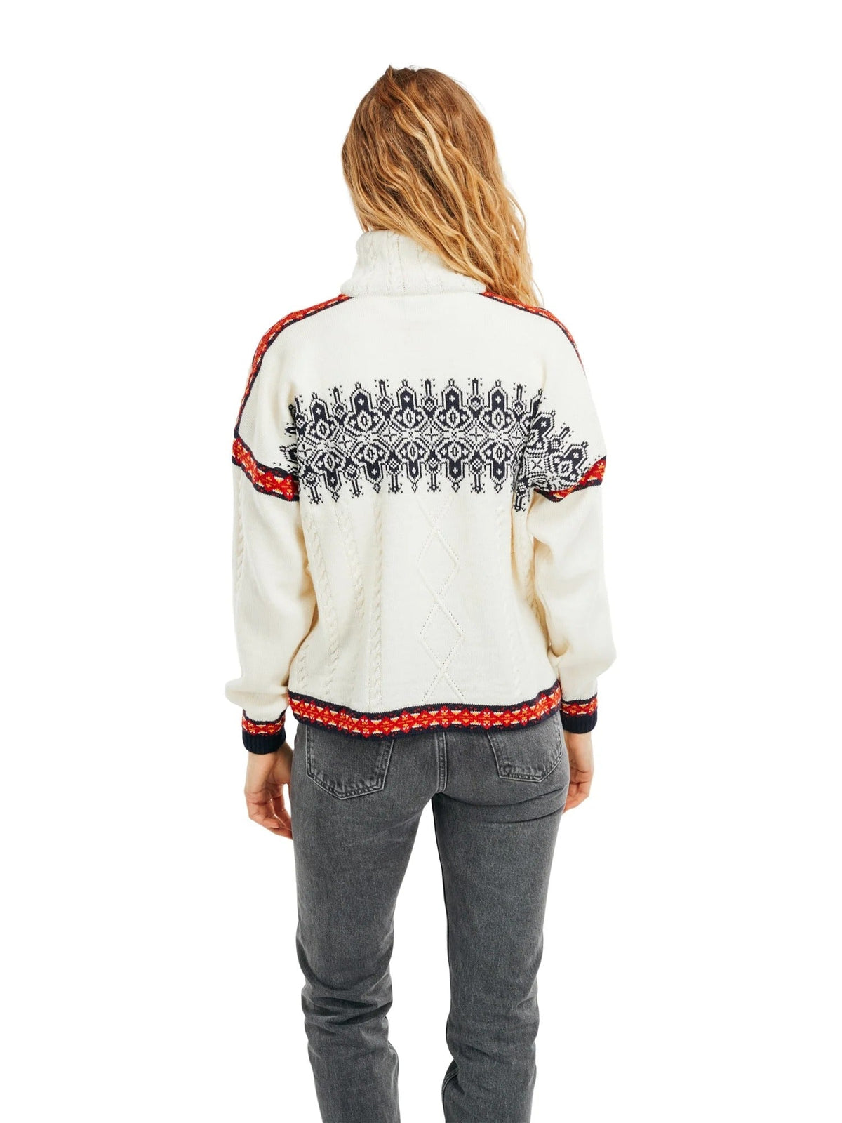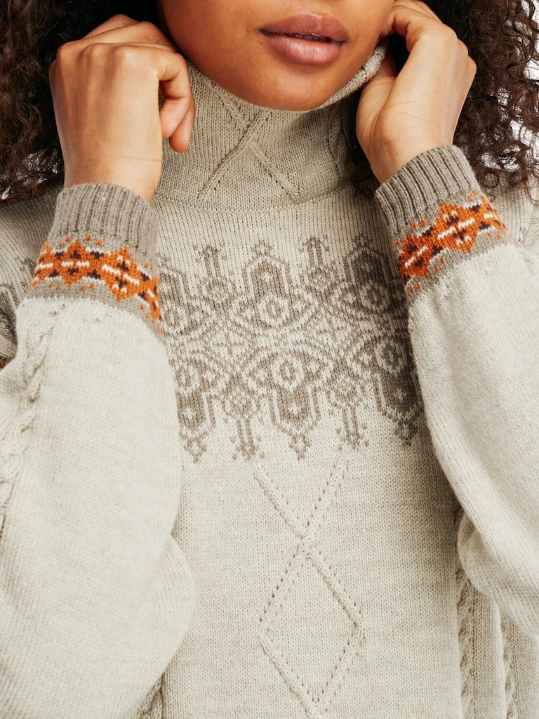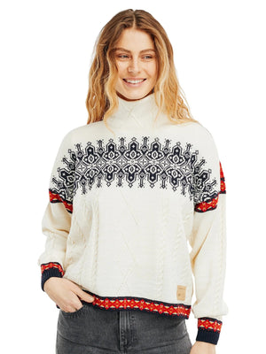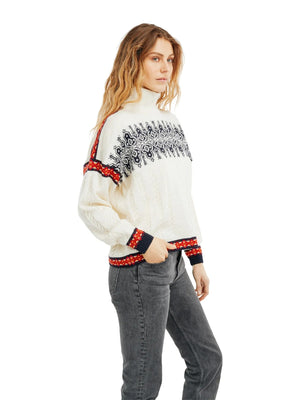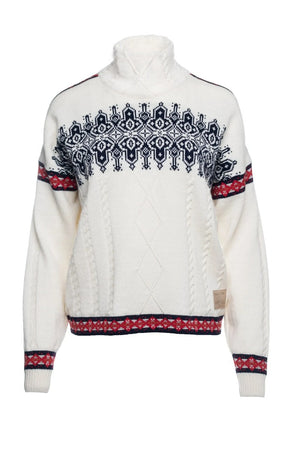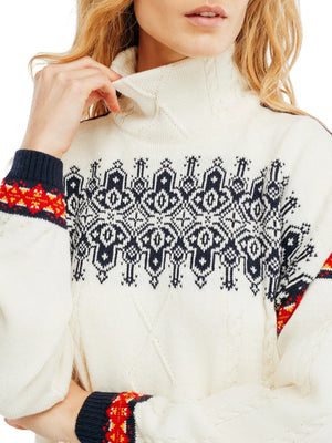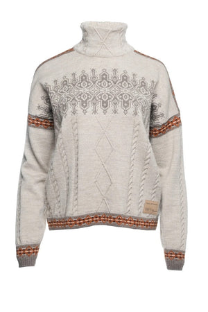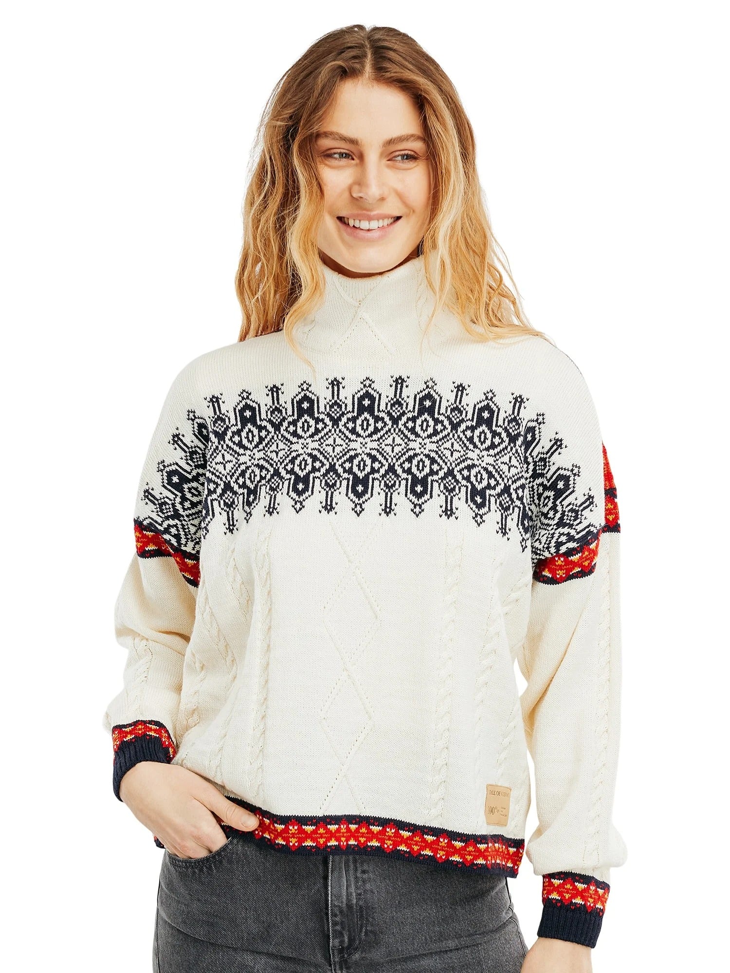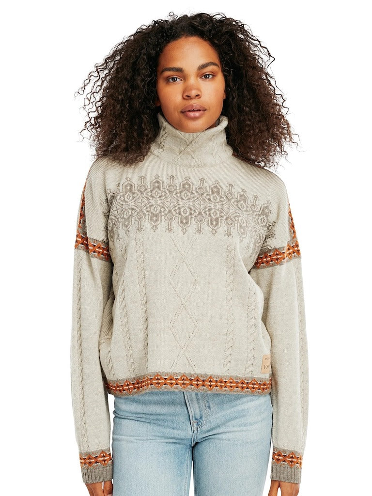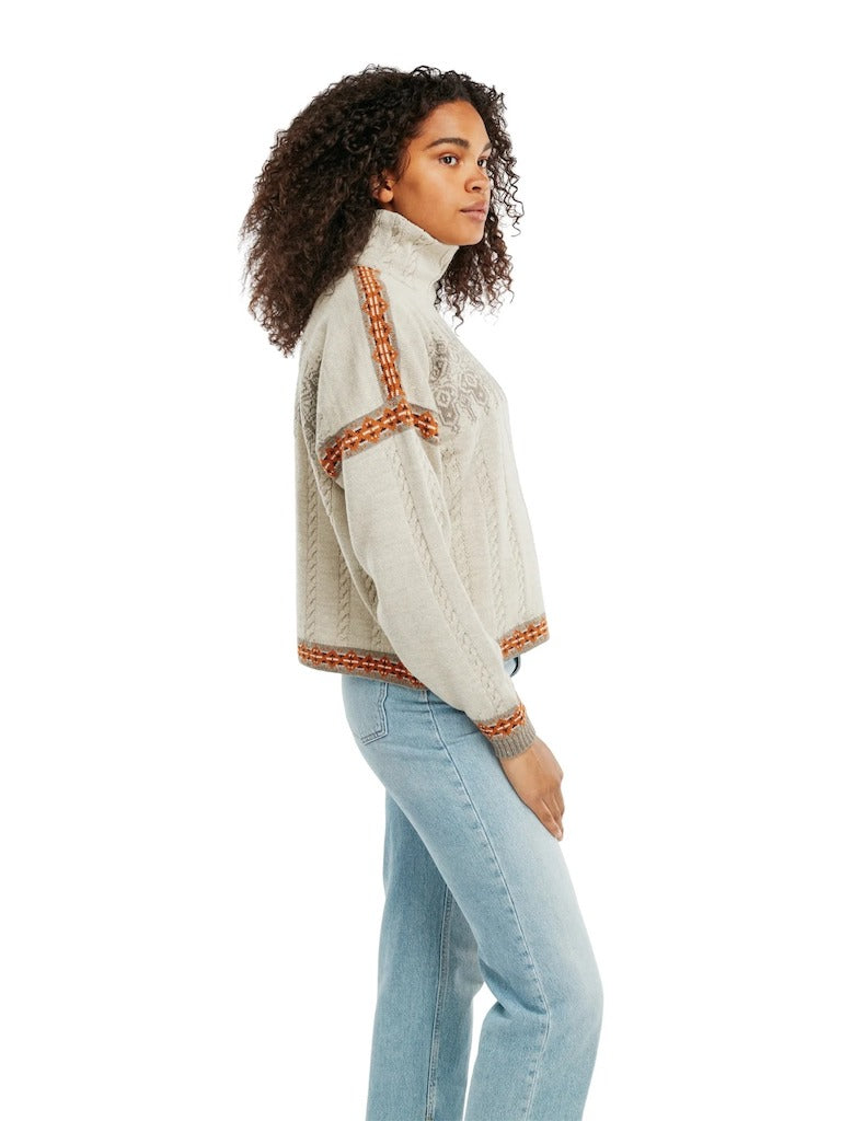 A loose fit, oversized, cropped sweater inspired by our 1992 Albertville Olympic sweater. This comfortable wool sweater features a combination of cable knit and knitted patterns. The cable knit high neck is lined with skin soft merino wool for extra comfort. Drop shoulders and rib knit cuffs tops off this sweater made with 100% lightweight wool. This light and soft yarn is perfect for mid-layer garments requiring a lighter and softer feel. To make it machine washable it undergoes a revolutionary new wool treatment using natural non-toxic salts.