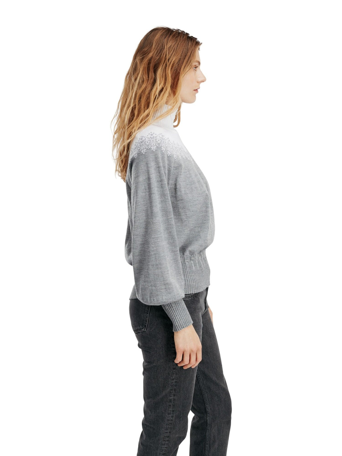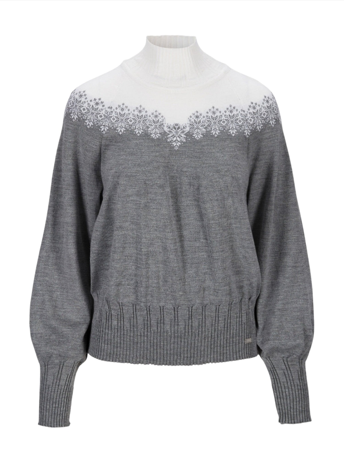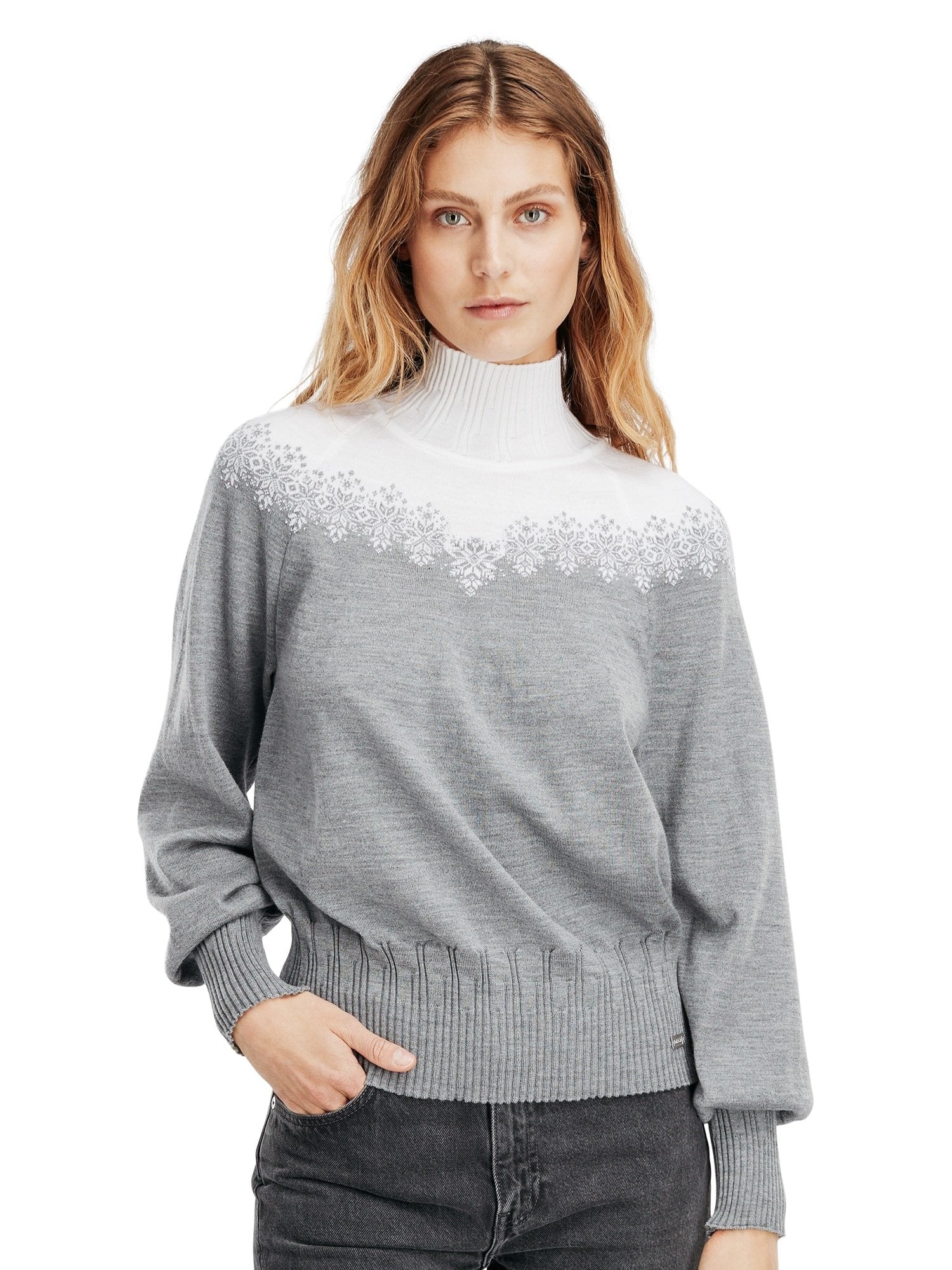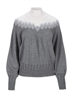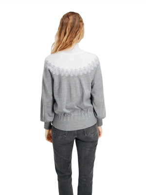 This cocoon shaped sweater features a high neck, slightly roomy sleeves and generous, asymmetric rib knit in hemline, cuffs, and neck. The snow crystal pattern gives a hint, this is a sweater equally fit for après ski and city streets.