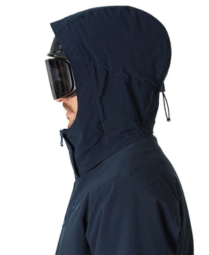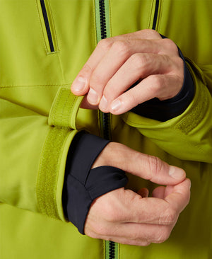 More premium ski features include: a detachable and helmet-compatible hood, a neon coloured brim, a ski pass pocket, a stretch powder skirt, and wrist gaiters with thumb holes.
