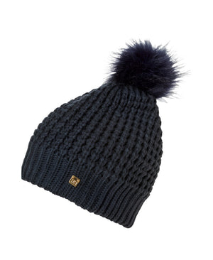 A knit pom beanie with a cozy inner fabric