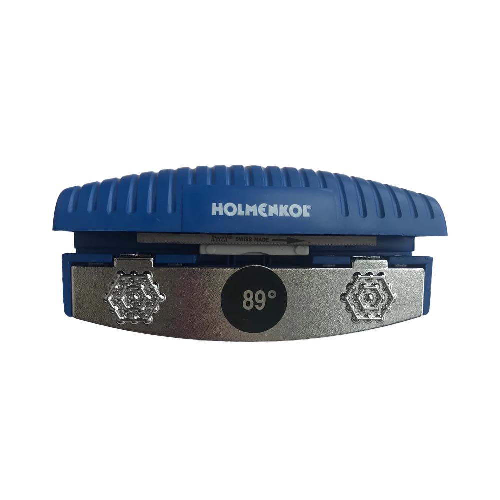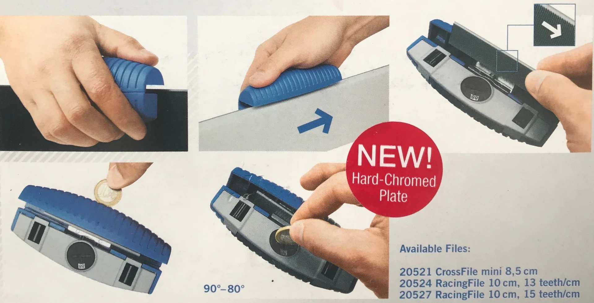 The Holmenkol Ergo Profi side edger includes a Cross file mini and this tool can sharpen your side edges from 90 to 85 degrees in 1/2 degree increments.