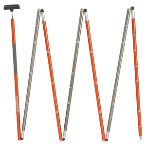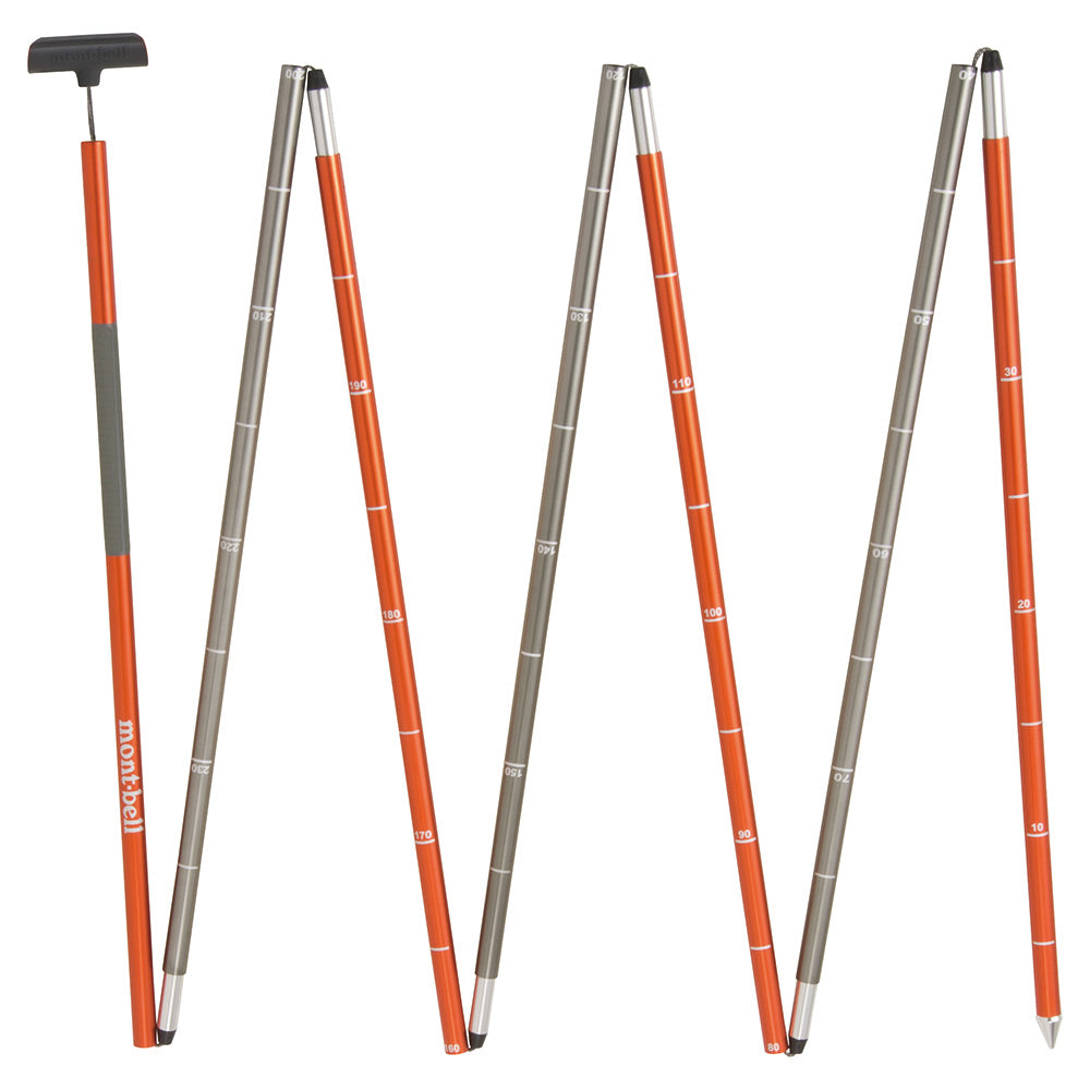 A lightweight ratchet button avalanche probe that can be instantly put together. Pull the tension cord to automatically lock the ratchet buttons and expand the item. Now there’s no need to deal with complex assembly instructions. The shaft contains tick marks in increments of 10cm. Insert in snow to instantly get a reading. The aluminum pole is colour-coded at 40cm intervals. The tension cord features Dyneema, which offers lightweight and excellent durability. Includes a stuff sack that can be accessed even with gloves on.