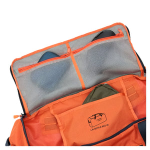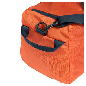 Lightweight yet durable fabric is equipped with a wide-opening, U-shaped zipper to facilitate easy access. The angled handles provide stability while carrying any amount of luggage. The duffel bag pockets into itself, allowing for compact carrying.