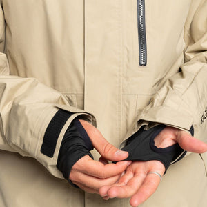 - Cuffs: Integrated stretch wrist gaiters