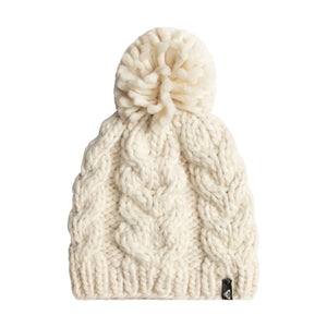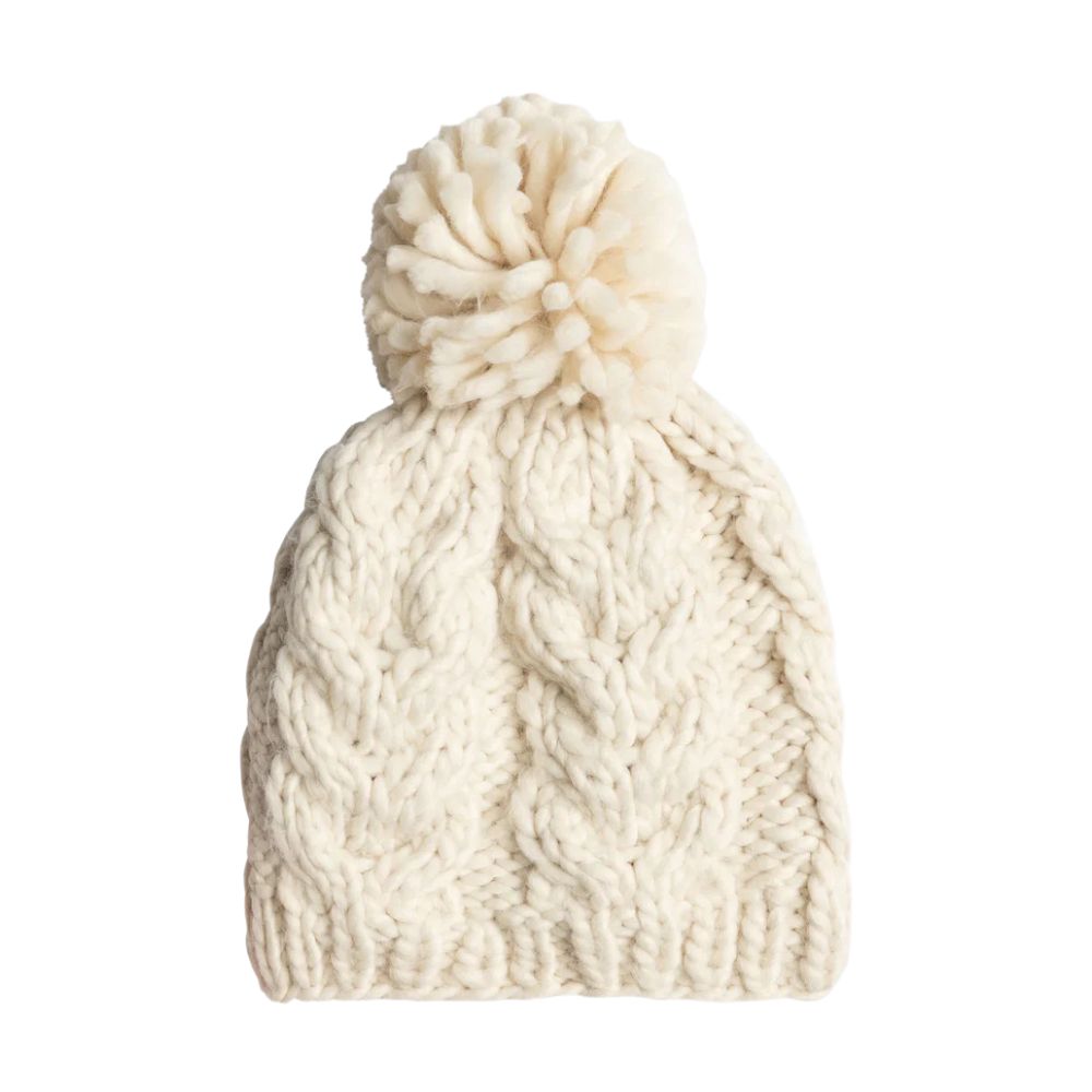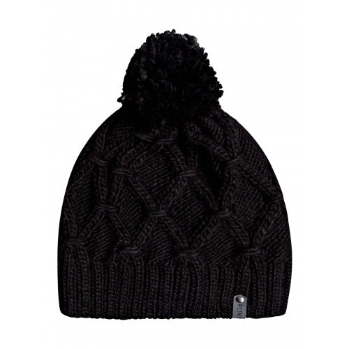 Women's pom-pom beanie featuring acrylic fabric, a polar fleece lined band, and finished with a cable knit design.